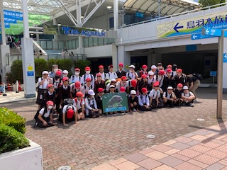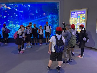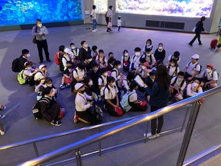?記念撮影の後、入館、班行動になります。巨大水槽の前で、ならいさんからグループごとに写真を撮ってもらっています。