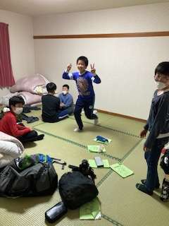 夕食後、室内オリンピックまでの間の時間、やる事なくて、部屋で踊ったり、歩き回ってます。(男子)