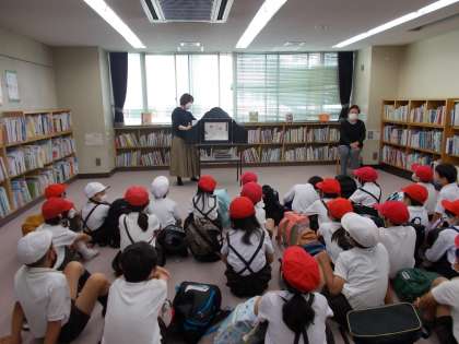 図書館職員の方に、図書館の使い方を聞いたり、読み聞かせボランティアの方から「虎と干し柿」というお話を聞いたり、図書館の秘密をたくさん教えてもらったりしました。