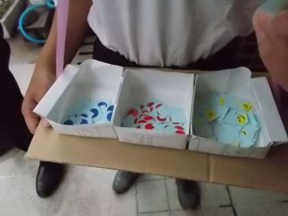 代表委員会で話し合って、「目を見て」「明るく」「大きな声で」の3つの項目であいさつができれば、黄色のシールを、2つなら赤シール、1つなら青シールを個人に渡しています。