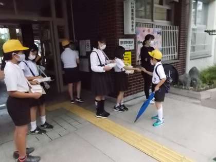 今週あいさつ週間です。代表委員の児童が玄関に立って、あいさつ運動を盛り上げます。