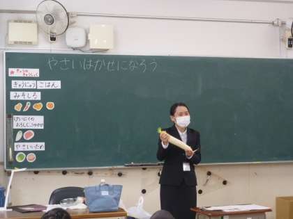 2年1組を中心に教室で実習している、栄養教育実習生の研究授業がありました。