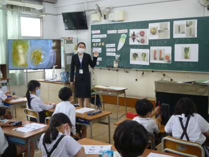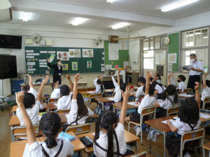 はっきりした声で、ジェスチャーも入れ、実物も見せながら、また、子どもたちの反応を感じながら授業を進めました。子どもたちも興味津々で学習しました。