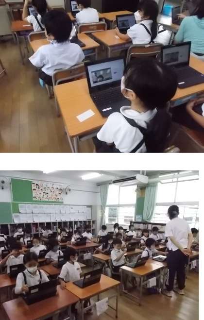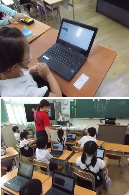 教室内で、先生と子ども達の双方向通信(class room)の練習をしました。去年は、1年生用タブレットを使って(Teamsで)しましたが、今年からは1人1台学習者用端末を使います。