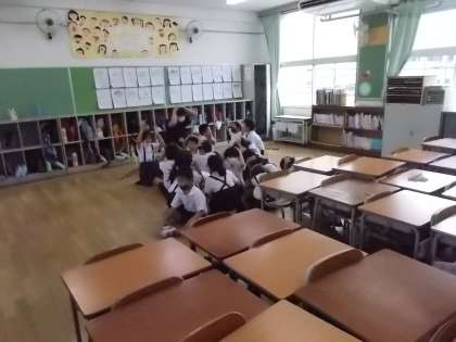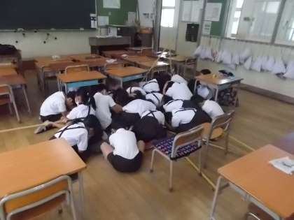 の放送が流れました。ちょうど本校は掃除の時間だったので、机の下にかくれることができませんでした。そんなときは、壁や窓から離れて、身をかがめて頭を守ります。