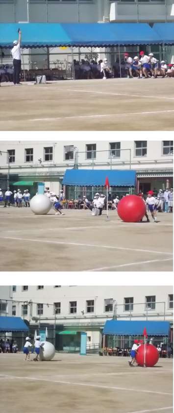 開会式のあと、応援合戦、4年生個人競走、2年大玉ころがし。