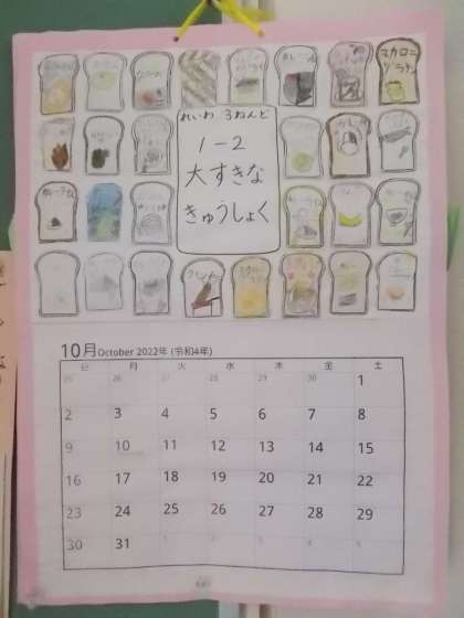 給食室の10月のカレンダーです。去年の1年2組の子どもたちの作品(給食の大好きなメニュー)です。
