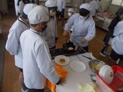 前日に、「ホットケーキが膨らむコツ」の動画を観て、ふっくらとしたホットケーキを作ろう!と取り組みました。学習の成果があり、どの班もふっくらと膨らんだホットケーキができました。