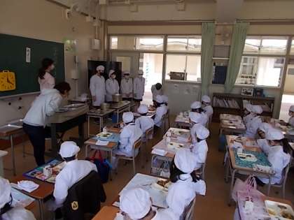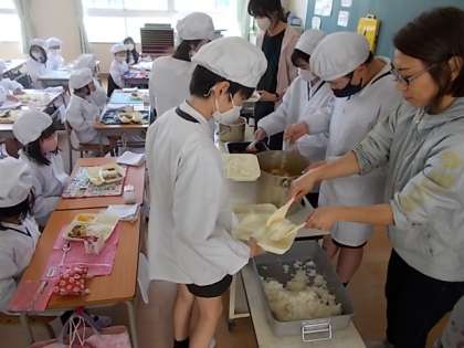 学校生活に慣れるまで1年生の給食を6年生が用意します。