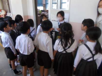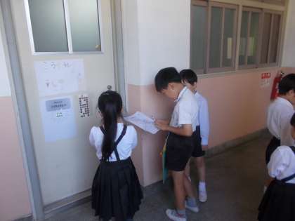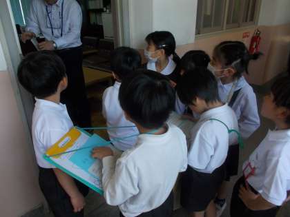 1年生と2年生が、校長室や図書室、保健室、給食室など、校内の様々な場所を巡る「学校たんけん」の活動に取り組みました。班単位で、2年生が案内役となり、1年生を各場所に連れて行きました。2年生が各場所の説明をした後、場所ごとの暗号を「たんけんマップ」に記入したり、設置してあるシールを貼り付けたりして、楽しみながら活動することができました。1年生は、2年生の言葉をしっかりと聴き、2年生は、1年生がはぐれないように注意しながら、一生懸命校内を歩き回りました。2時間ほどの活動でしたが、1年生と2年生が交流し、協力できたことは、児童にとって良い経験になったと思います。