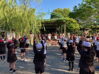 体操係を中心に、ラジオ体操をして、体を目覚めさせます。