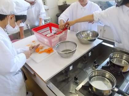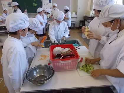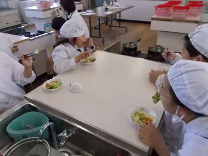 前日の2組と同様、真剣に調理に取り組んでいました。はじめは、これであってるのかな?と恐る恐る作業していましたが、班で協力し合い、おいしいゆで野菜サラダを作ることができました。