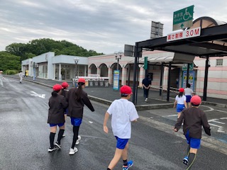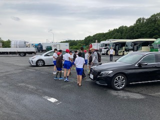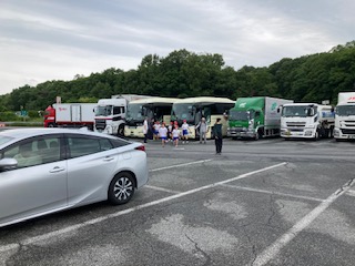 予定通り、9時5分赤松PA着。バス酔いしている子もいますが、みんな元気です。雨は降っていません。半袖だと肌寒いです。