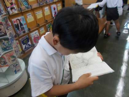 その後は、図書館の中を自由に見学し、自分の好きな本や図鑑などを探す活動をしました。昆虫の図鑑やかいけつゾロリなど見つけた本を手に取って読んでいる姿が微笑ましかったです。