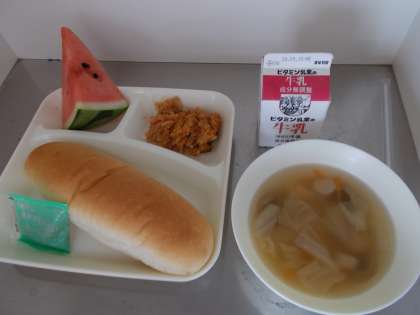 「パエリア・ウインナーとキャベツのスープ・すいか・コッペパン・りんごジャム・牛乳」