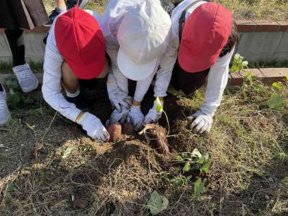 「ここにもある!」と鋭い観察力でサツマイモを見つけては、友だちと協力して掘り進める姿が見られました。