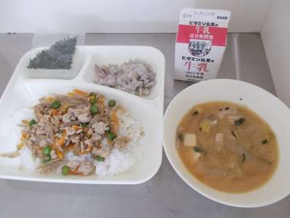 鶏ひき肉とつきこんにゃく、ごぼう、にんじん、グリンピースを煮含めた具材をごはんにかけて、混ぜ合わせて食べます。