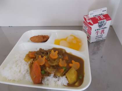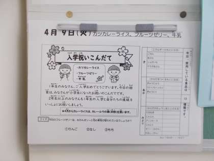 入学祝いこんだてです。1年生にとって初めての給食。1年生は1組も2組も食欲旺盛!おいしいおいしいといって、平らげていました。
