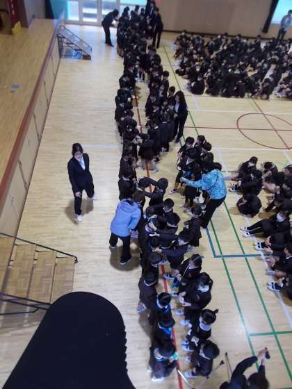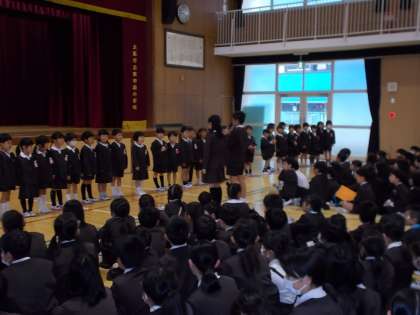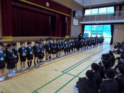 新1年生との対面式です。児童会代表児童から、歓迎の言葉を述べ、2年生から歓迎のメダルとあさがおの種をプレゼントしました。