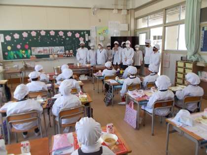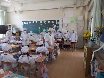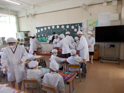1年生の給食の準備、片付けを6年生が手伝っています。