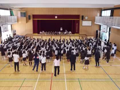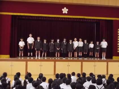 今年度初めの児童集会でした。今日は、この1年間、木曜日の児童集会を進めていくメンバー紹介をし、王様ジャンケンをしました。