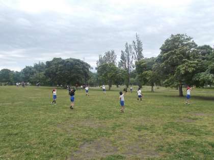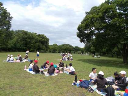 大芝生広場では、風がきつかったけれど、お弁当を見せ合いながら、ワイワイと楽しそうに食べていました。その後、お楽しみ係の声かけで全員でのしっぽ取りゲームが始まりました。思いっきり走り回ってもまだまだ遊びたりない様子のまま、帰路につきました。