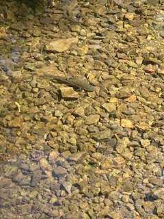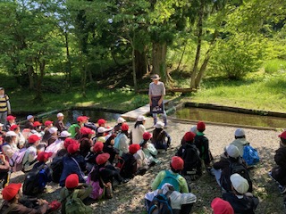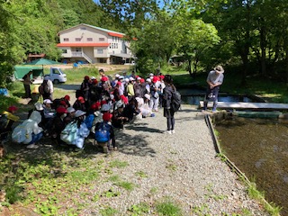 湧水だけでできた川なので、名前はありません。水量も少ないので、せきとめて池みたいにしています。最終、円山川になって、日本海に流れ出ます。水温10度。跳び上がるほど冷たいです。川魚の女王「あまご」をつかまえます。谷常さんから説明を聞いています。