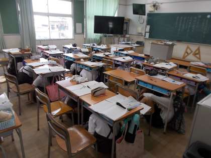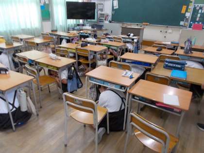子どもたちは机のしたに隠れるなど、「頭を守る行動」をしました。6年生は体が大きので体全体隠れるのは難しそうでした。大事なのは「頭を守る」ということを再確認しました。
