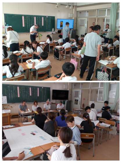 放課後には講師先生を招いて、授業の討議会も開きました。内容を整理し付箋に書いて表にまとめ、みんなで意見を交流しました。