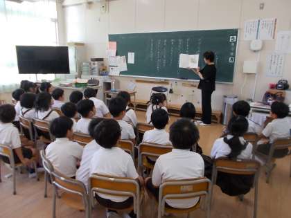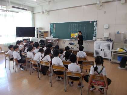 港図書館の読み聞かせボランティア「さざなみさん」によるおはなし会がありました。全クラス45分が読み聞かせの時間です。
