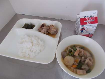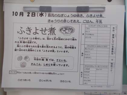 風にふき寄せられた落ち葉を思わせるように、秋の味覚を盛り合わせた煮物のことを「ふきよせ煮」といいます。今日はまだまだ暑かったですが、さといも、れんこん、こんにゃくにも味がしみしみでおいしかたったですね。
