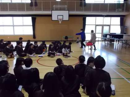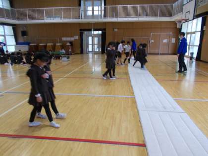 その後、アイマスクを使っての歩行体験で、誘導役の児童が教わったとおり友だちに声をかけて、マットを乗り越えることができました。