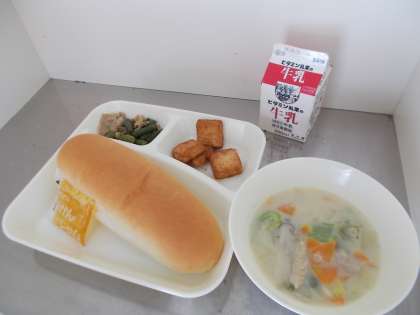 今日のはクリームシチューではありません。中華風の「クリーム煮」です。でんぷんでとろみをつけているのです。(だから食べてるうちに、唾液でさらさらになってしまった人もいたのではないでしょうか。)