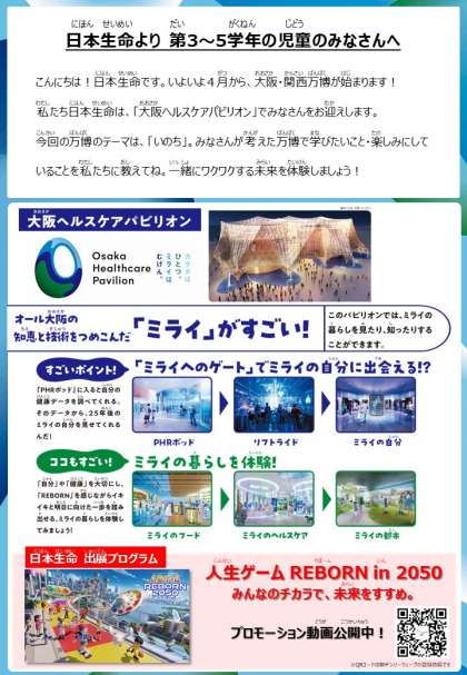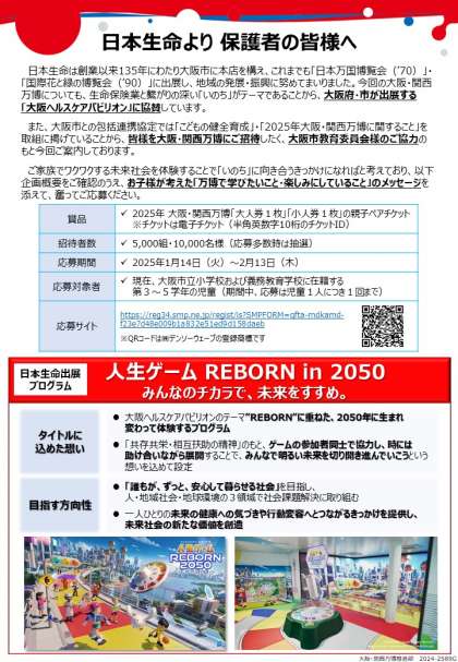 日本生命の方が、大阪市教育委員会から案内はしたが、学校によっては申し込みが0件でもったいないとのことでした。締切が2月17日まで延長されています。本校も1月8日に配布させていただきましたが、再度ご案内させていただきます。