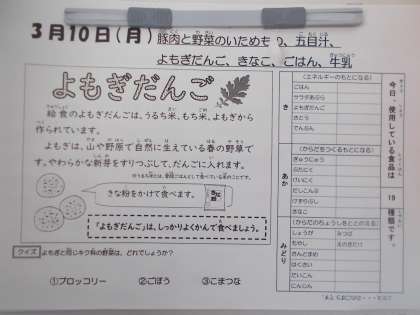 先生「よもぎの葉っぱをすりつぶして、だんごに入れていますよ。」
