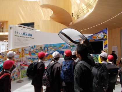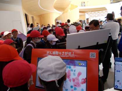 NTT、大阪ヘルスケアパビリオンでの様子です。みんな楽しそうに過ごしています。iPS心筋シートや、iPS心臓を見て驚いていました。