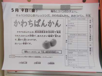 皮をむくのに、手がべちょべちょになり、時間もかかりましたが、結構みんなおいしそうに食べていました。今日のかわちばんかんは、熊本産でした。