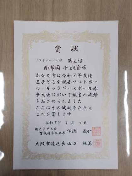 南市岡子ども会【ソフトボール】第3位の表彰、おめでとう。