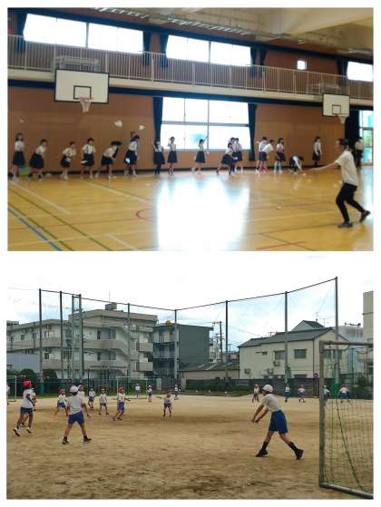 さて、体育館ではみんな一列に並び、なにかを投げている‥ようです。何をしているのでしょうか?