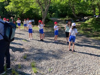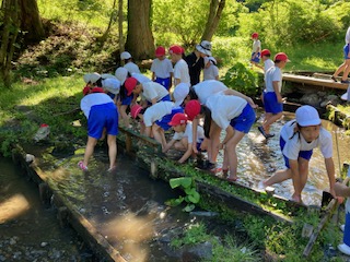 まだ1人で頑張って捕まえようとしている人、焼いてもらっているのを待っている人、食べている人、食べ終わって友達が捕まえるのを手伝っている人、いろいろです。