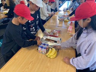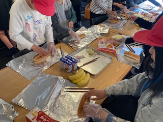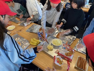 アルミ箔を2枚、重ねてパンにチーズとキャベツとソーセージを入れます。