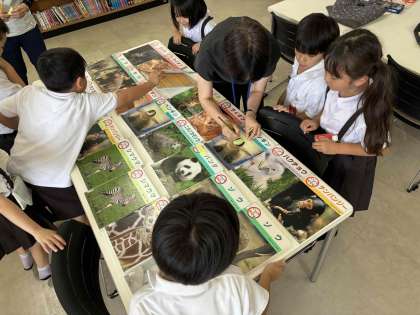 図書室で動物選びをしました。辻先生が用意してくださったたくさんの動物の本の中から、自分の好きな動物を選びました。