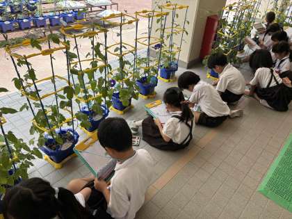 色が違う友だちの花と見比べたり、はみ出したツルをていねいに支柱に巻き付けたりと、生長を喜びながら観察していました。