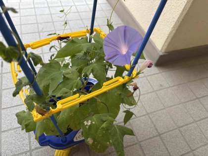 4月に種まきをしたあさがおのツルがのび、花が咲きました。