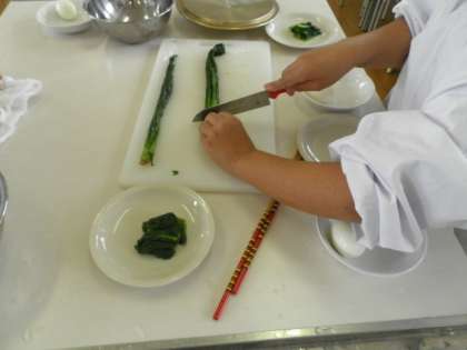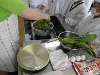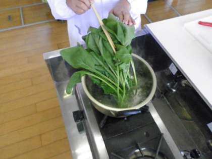 ホウレンソウは株元のほうから,お湯につけます。先生の仕方を見て,さあやってみましょう。