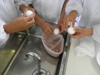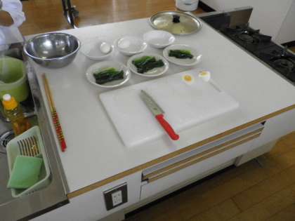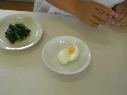 タマゴの殻を丁寧にむきます。しっかりと水けを絞って,ホウレンソウは包丁で切ります。「ネコの手」で慎重に切ります。
