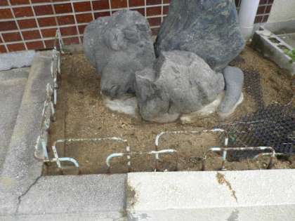 玄関横の石組みの土が取り除かれています。