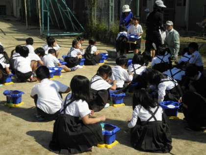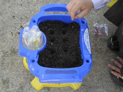1年1組と2組が合同で、植木鉢に種をまいています。土と肥料を混ぜて、種を入れて・・・さあ、何の種かな?お子さんに聞いてくださいね。