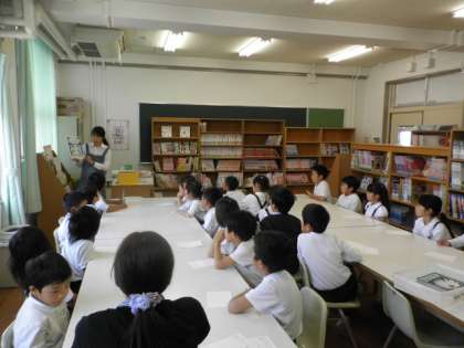 2年2組が新しい図書室で、学校図書館補助員さんから本の貸し出しなどの説明を聞いています。毎週金曜日には、いろいろなお話が聞けるかも・・・楽しみです!