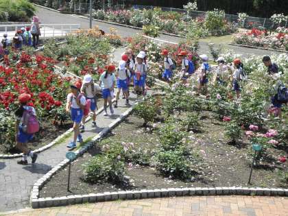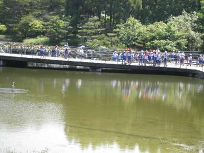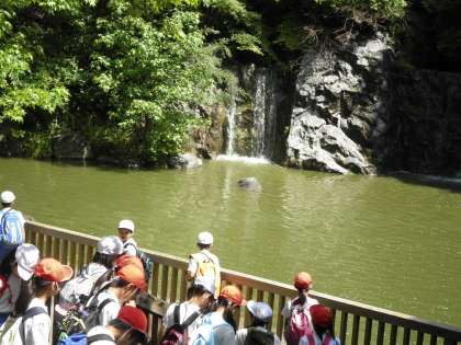 3・4年生のふれあい班で,オリエンテーリングをします。池の横や滝を見ながら,スタート地点へ行きました。